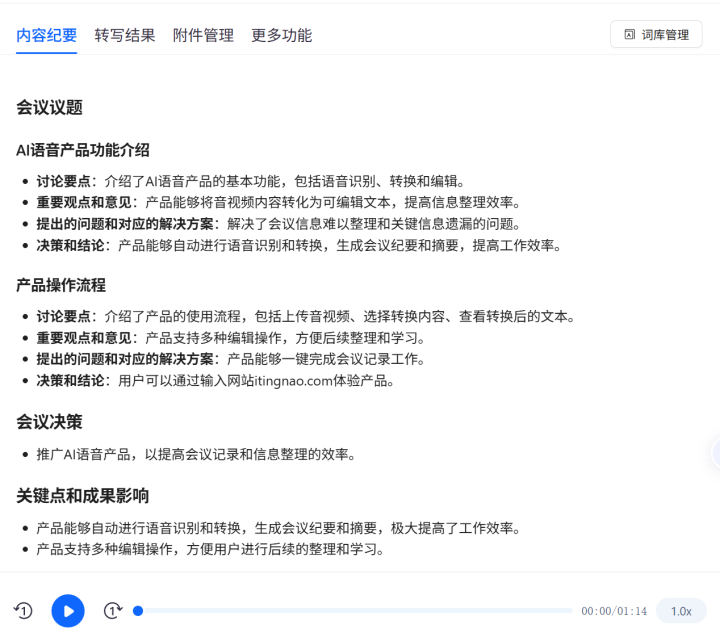 最后给大家提个使用建议:不同场景选对模式很重要。职场人处理会议,选“会议模式”,会优化专业术语识别,还能提取行动项;学生党转网课,选“学习模式”,标注知识点更方便;销售转客户视频,选“销售模式”,提取需求点更准确;内容创作者转自己的视频,选“内容提炼模式”,找核心观点更快。